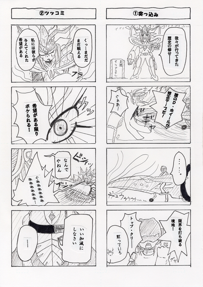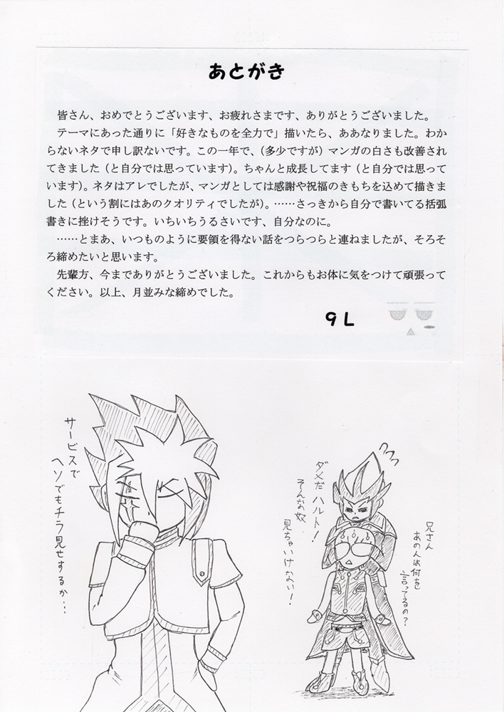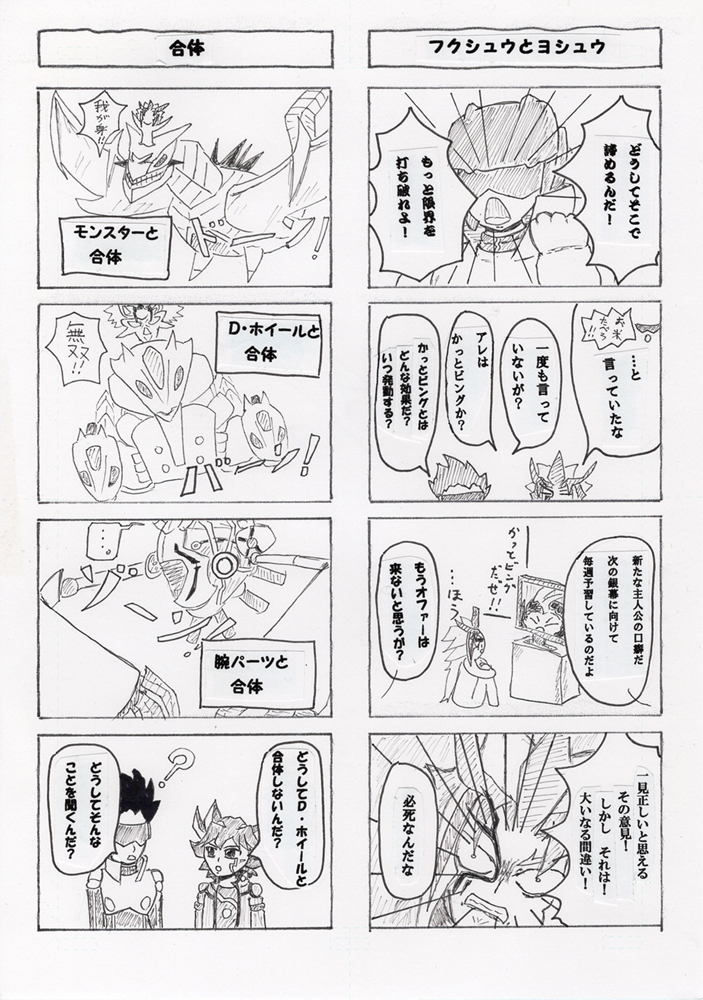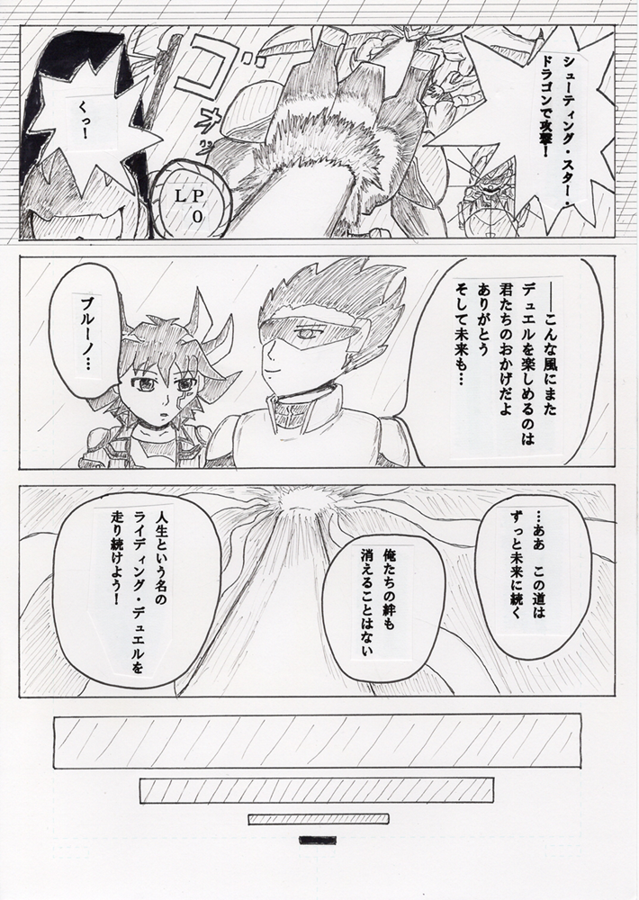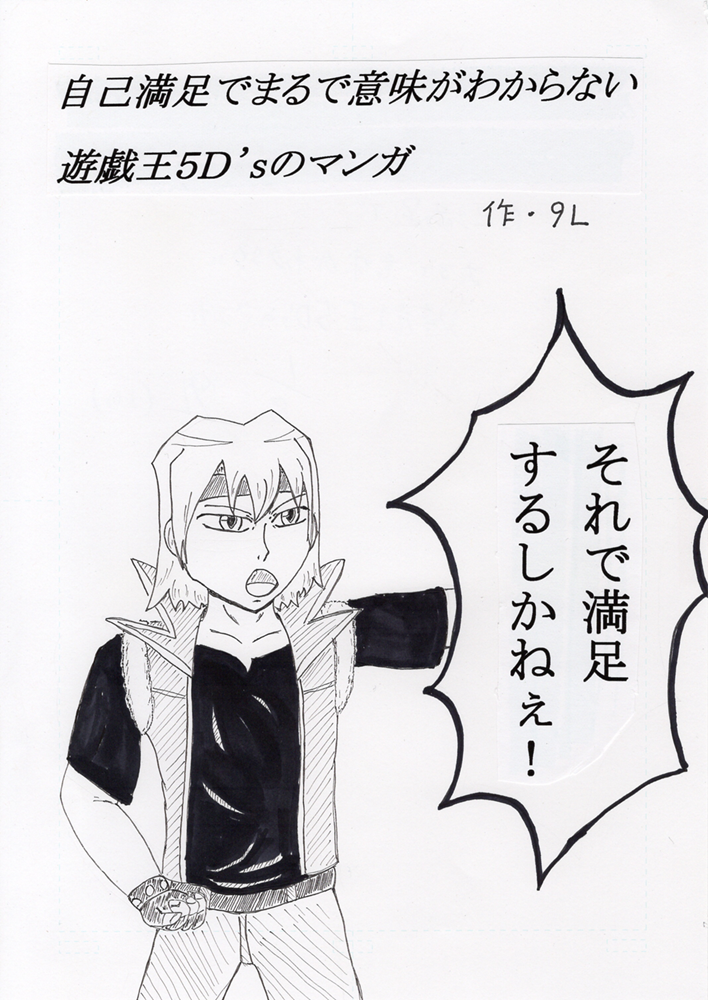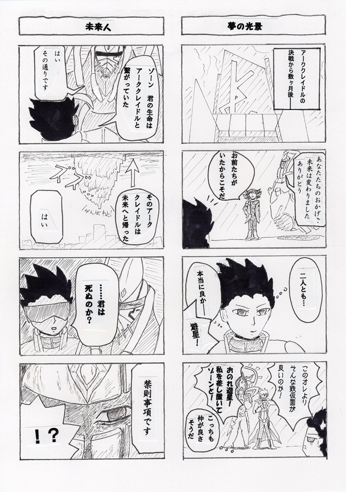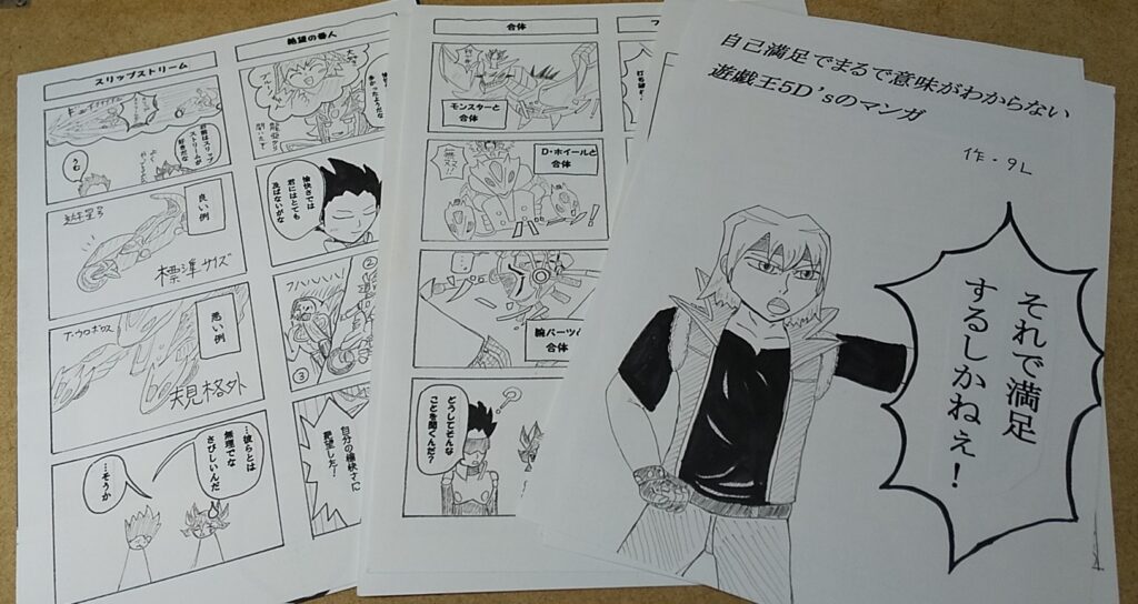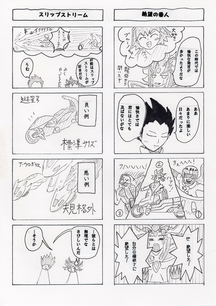 当時に(今もですが)熱を上げていた「遊戯王5D‘s」の4コマで、在籍中に唯一描いた二次創作です。ゲームの攻略本やらキャラブックを作画資料にして、下手くそなりに一生懸命描いたのが思い出されます。