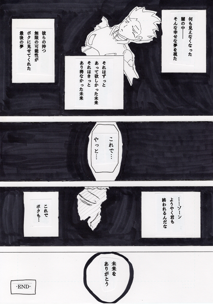 これのほかに、一次創作の「メガネ」「幽霊と男」「赤ずきん」「『月姫』『空の境界』に影響された中二病少女」は描いた記憶があります。原稿は紛失しているっぽいですが、部誌は物置部屋にありそうです。現在が辛くなったら、過去を読み返すのもよいかもしれません(ただし、当時は『ストーカーの件』の真っ只中だったので、それはそれで何とも)。