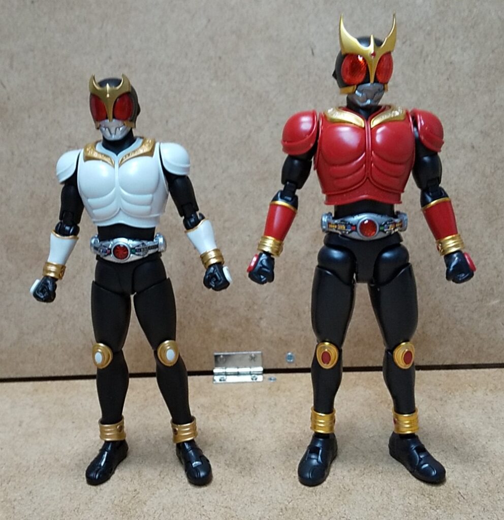 先述の通り、真骨彫の赤のクウガは未所持なので、白のクウガで比較します。並べてみると、体型バランスはよいのですが、やはりプラモデルの方が大きいです。これだけだと、フィギュアーツの代用品としてプラモを選ぶのは不適に思えます。