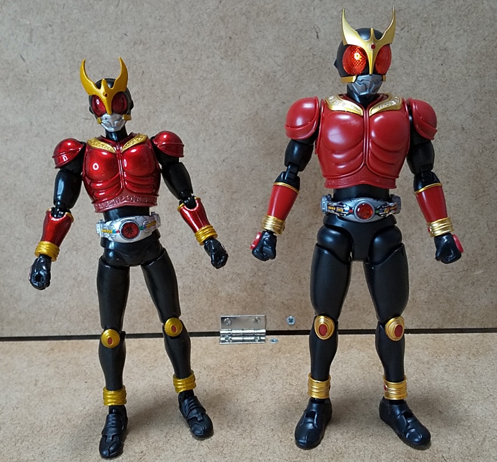 初期フィギュアーツ(画像左)のクウガと比較すると、随分大きく感じます。プラモデル(画像右)の方が、全身バランスというか、プロポーションがだいぶ劇中に近いです。初期フィギュアーツは最近のものと比べると、全体にやや小さめなので、比較対象としては適切ではなかったかもしれません。