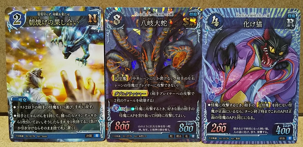 青のデッキを強化するカードとして、日本妖怪のビッグネームである八岐大蛇が当たりました。玉藻の前や酒呑童子も是非実装してほしいです。