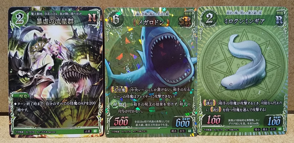 古生物の緑は恐竜ばかりという先入観がありましたが、そうでもないようです。少し前にインターネット上で有名になったサカバンバスピスなんかもラインナップされるのでしょうか。暴虐の流星群のカードイラストで恐竜を扇動している女の子がかわいすぎます。……扇動ではなく、隕石を落としているのでしょうか。ゼツメイツ?
